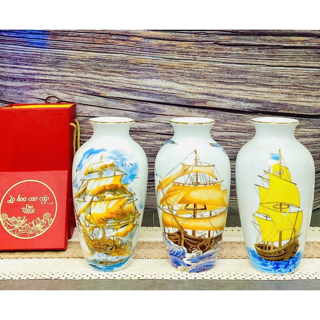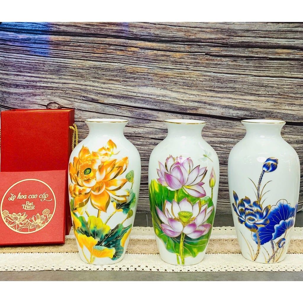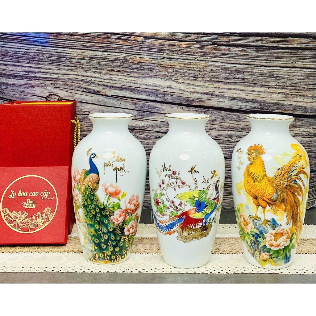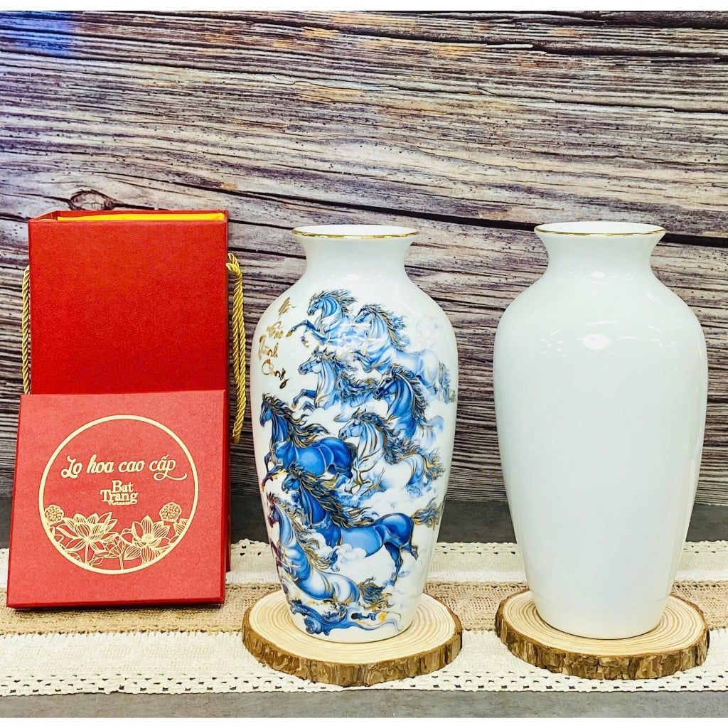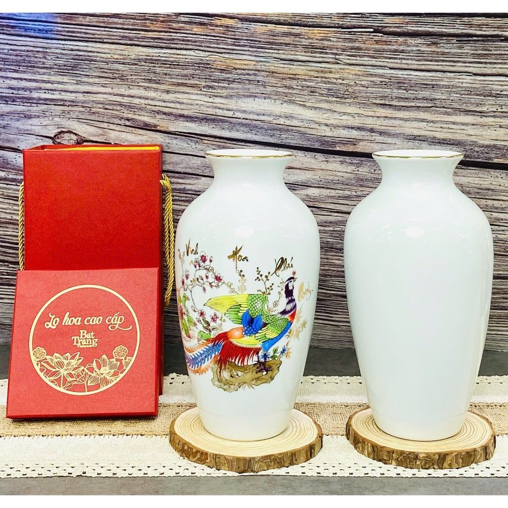 Bình hoa men trắng viền vàng kim vẽ cảnh