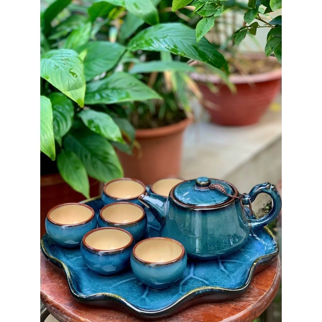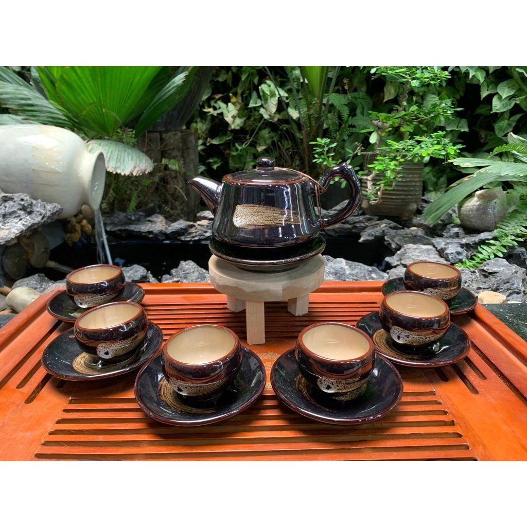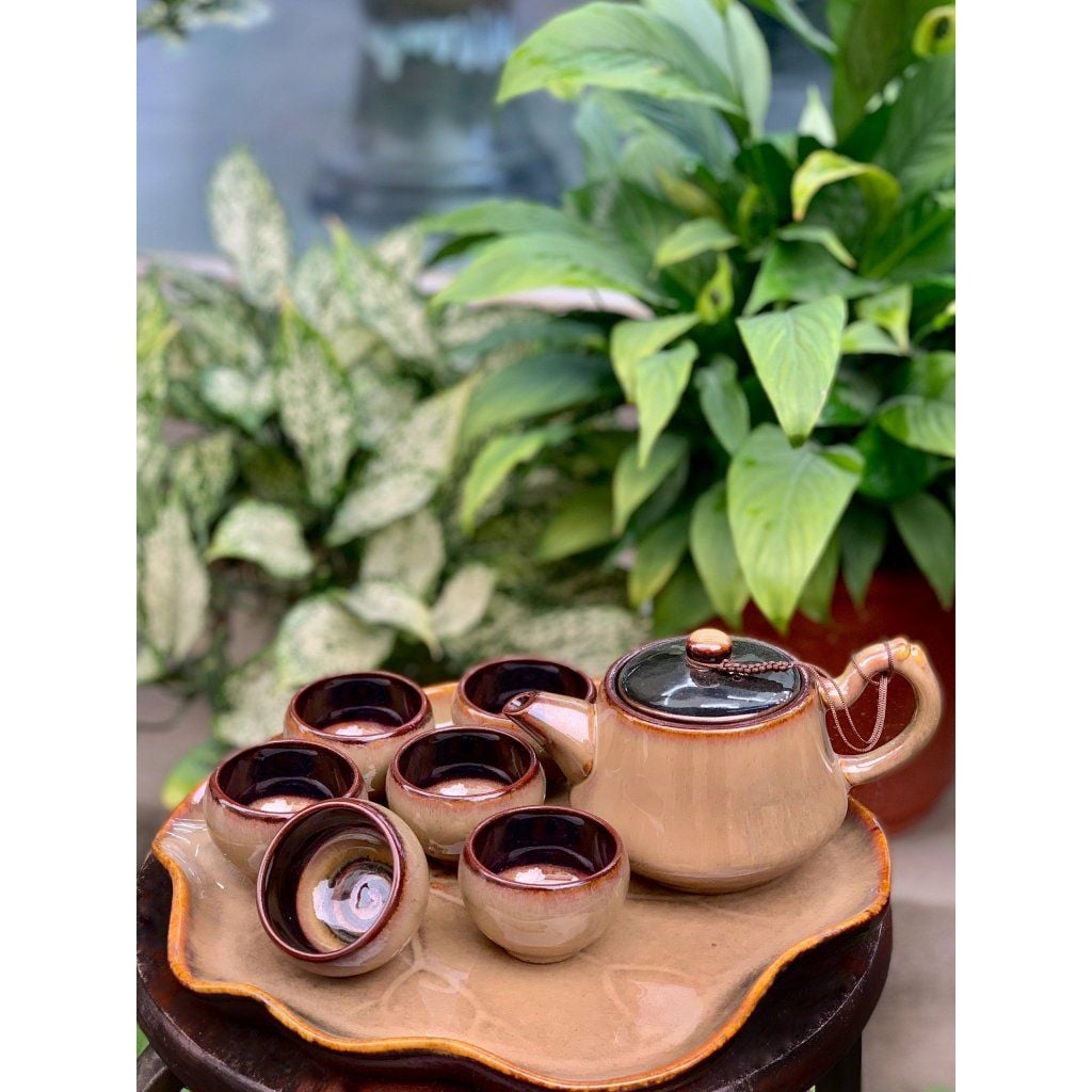 Bộ ấm chén men hỏa biến dáng quai trúc