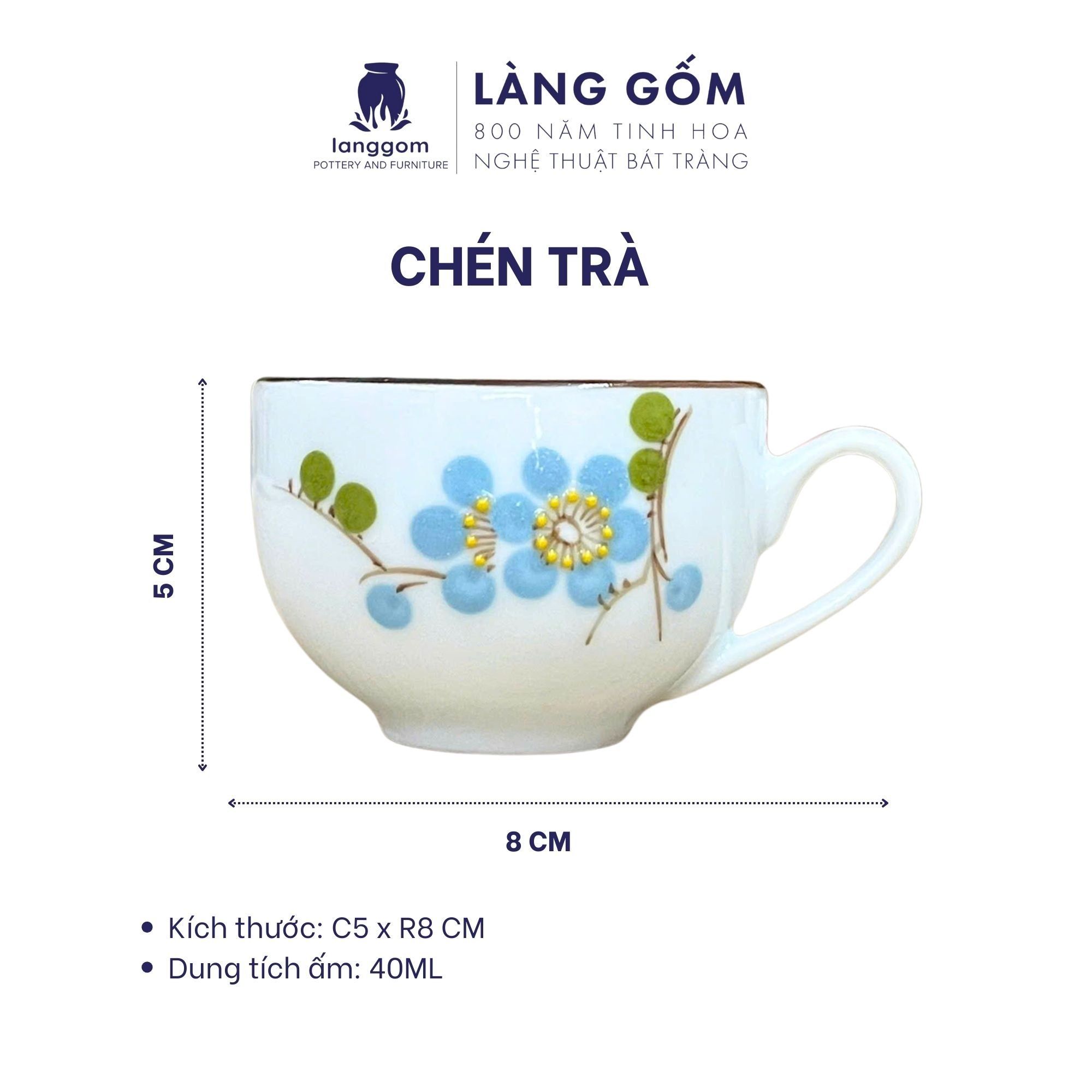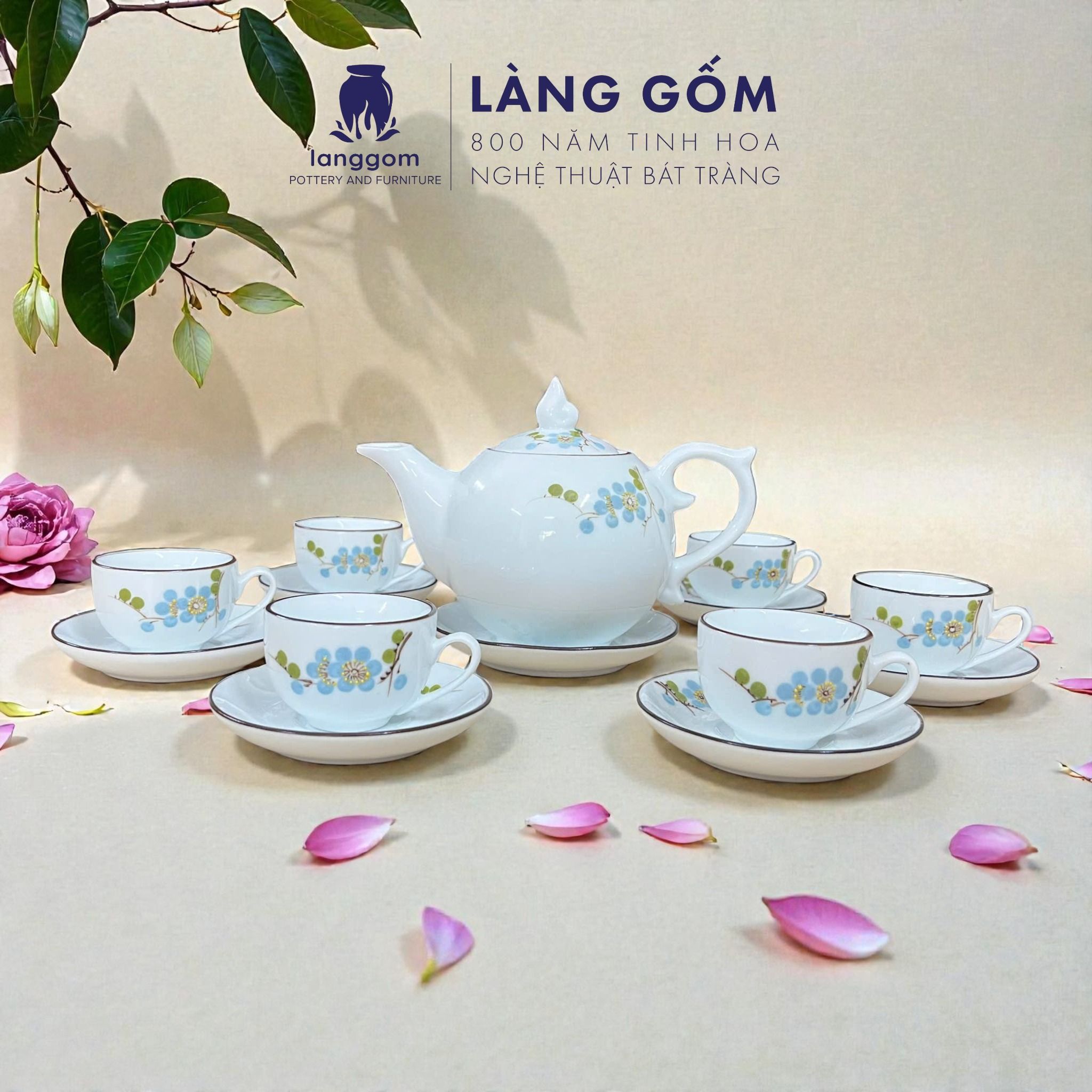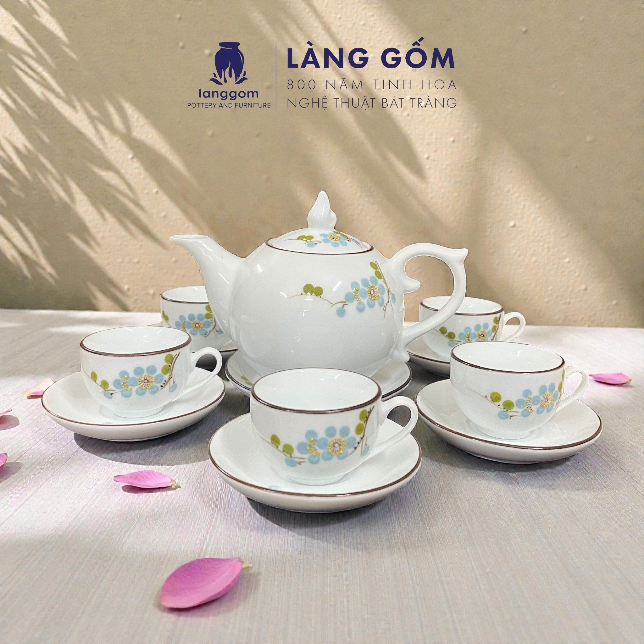 [GIÀM 20% - QUÀ TẾT 2026] Bộ ấm chén men trắng bưởi lửa vẽ hoa đào xanh kèm hộp