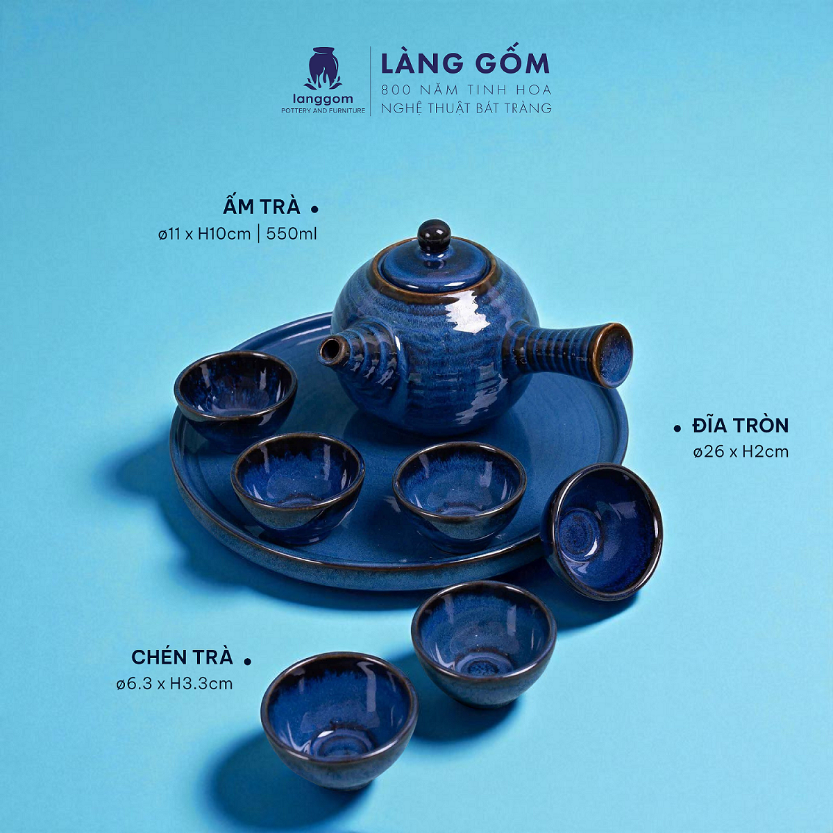 Bộ ấm chén quai chuôi men hỏa biến màu xanh sapphire