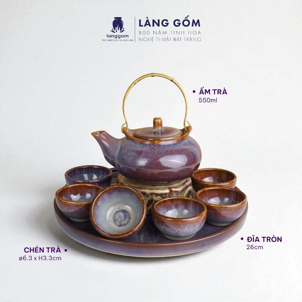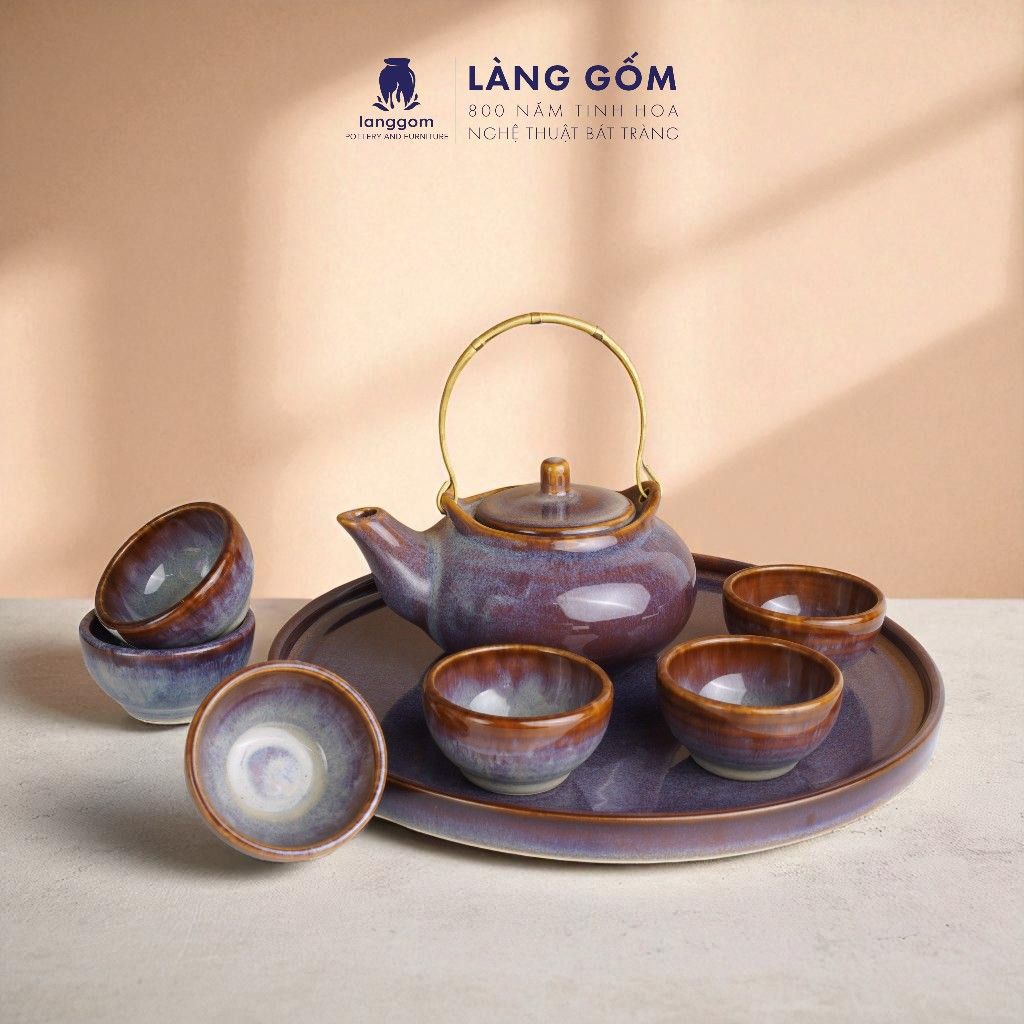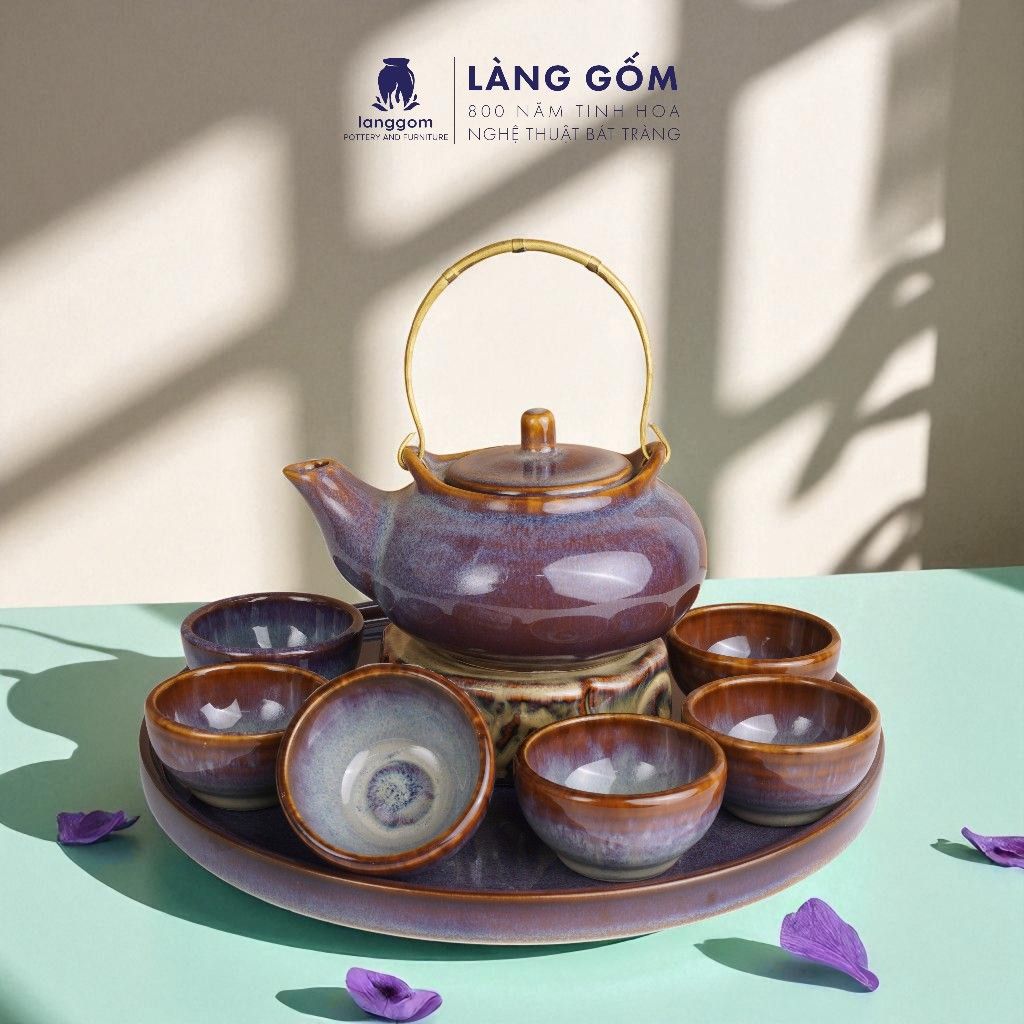 Bộ ấm chén quai đồng men hỏa biến màu nâu trầm