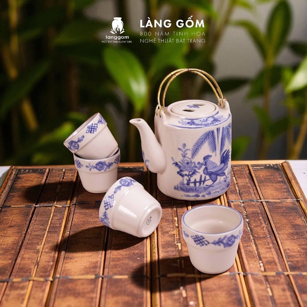 Bộ ấm tích Thôn quê thanh bình men lam vẽ gà trống
