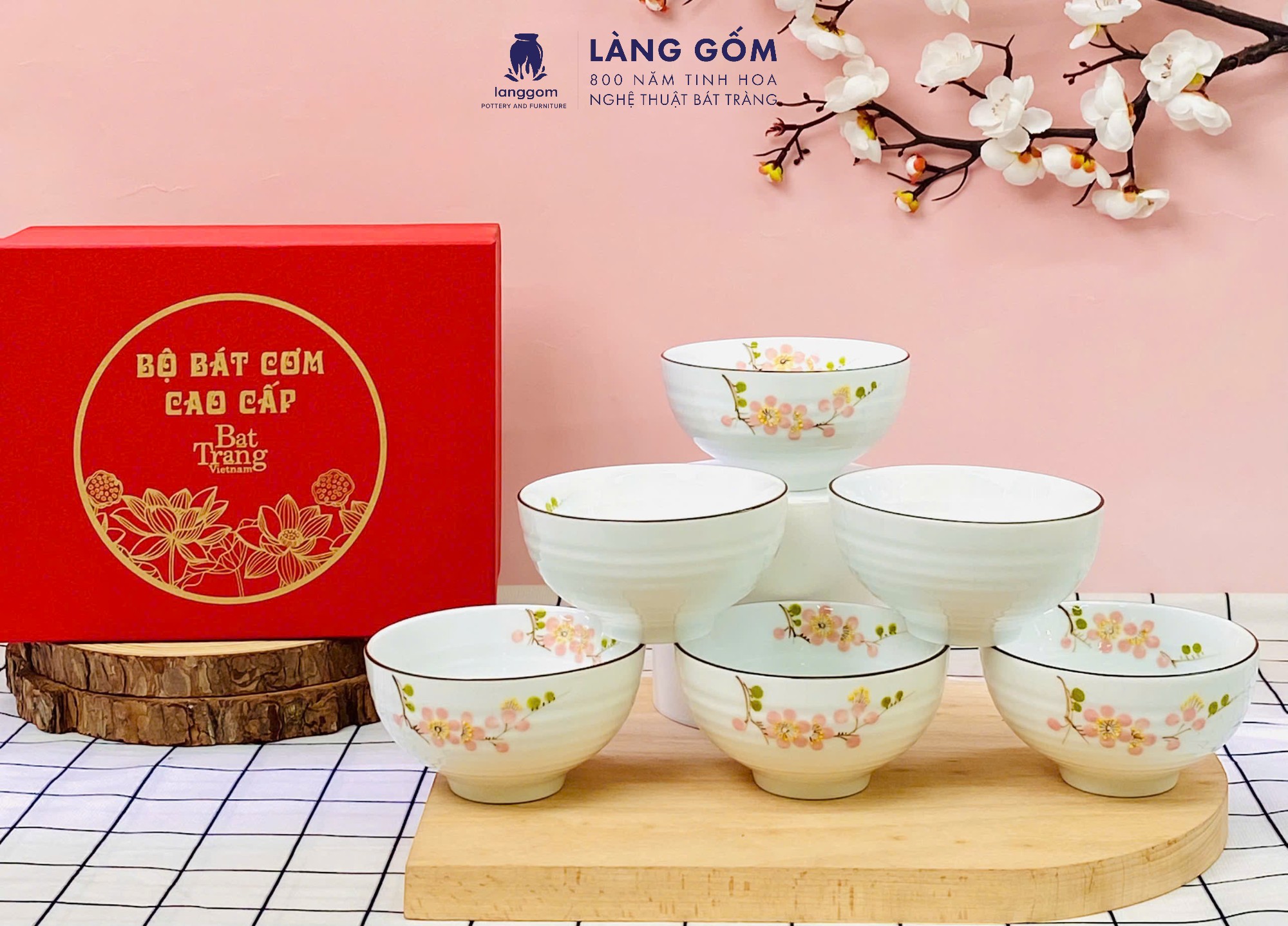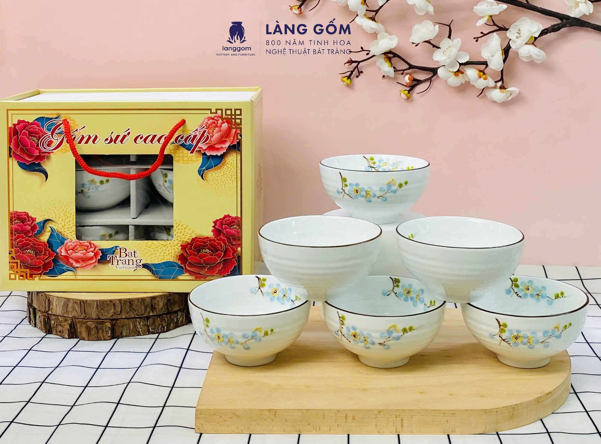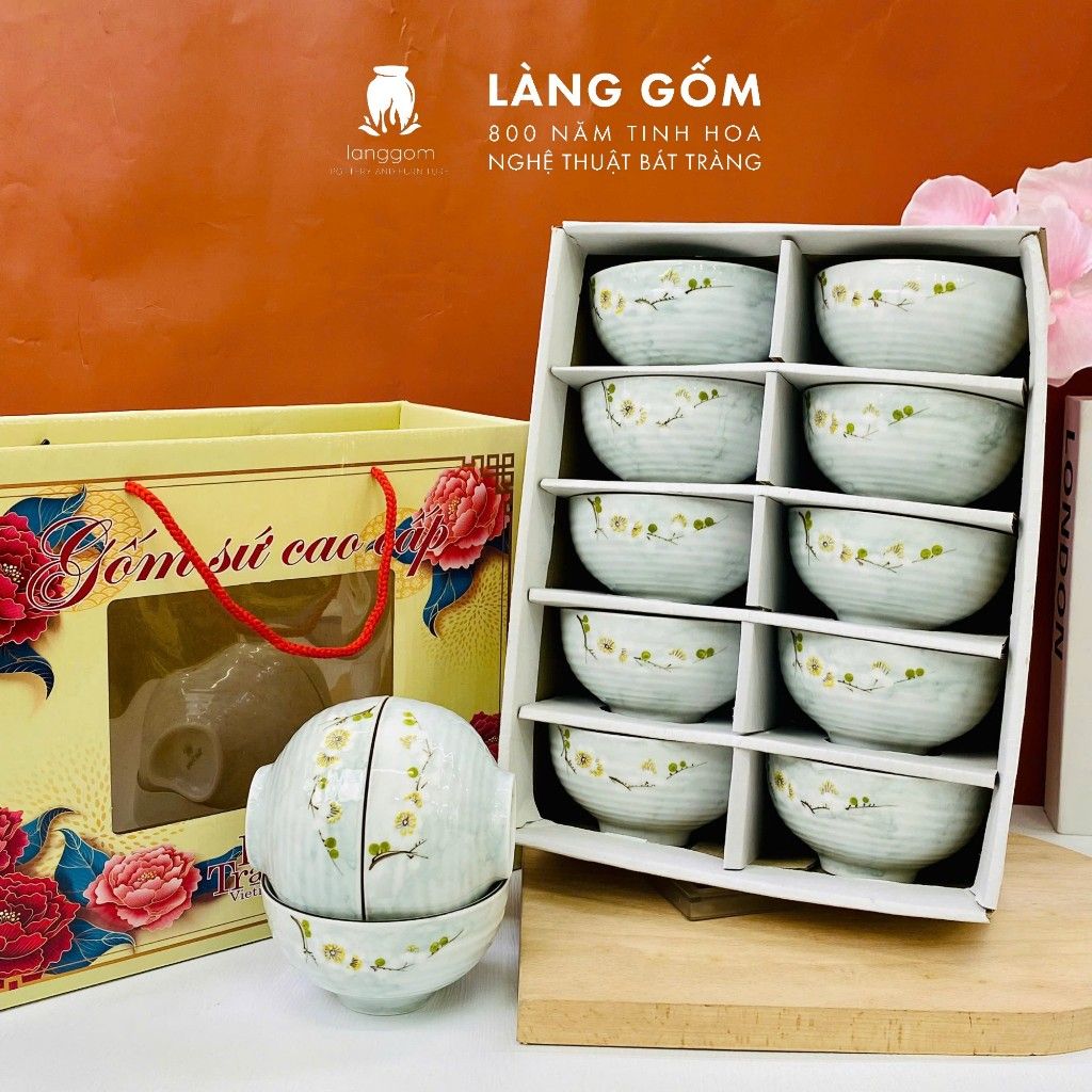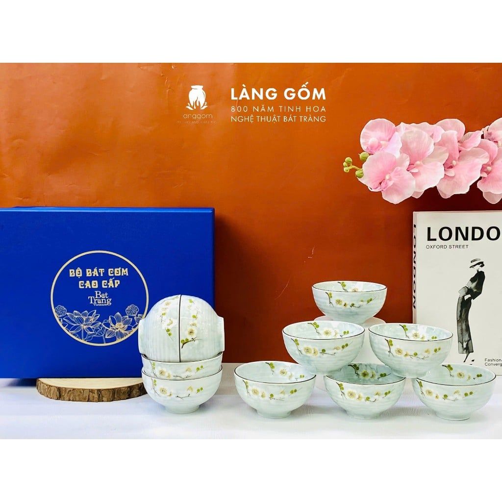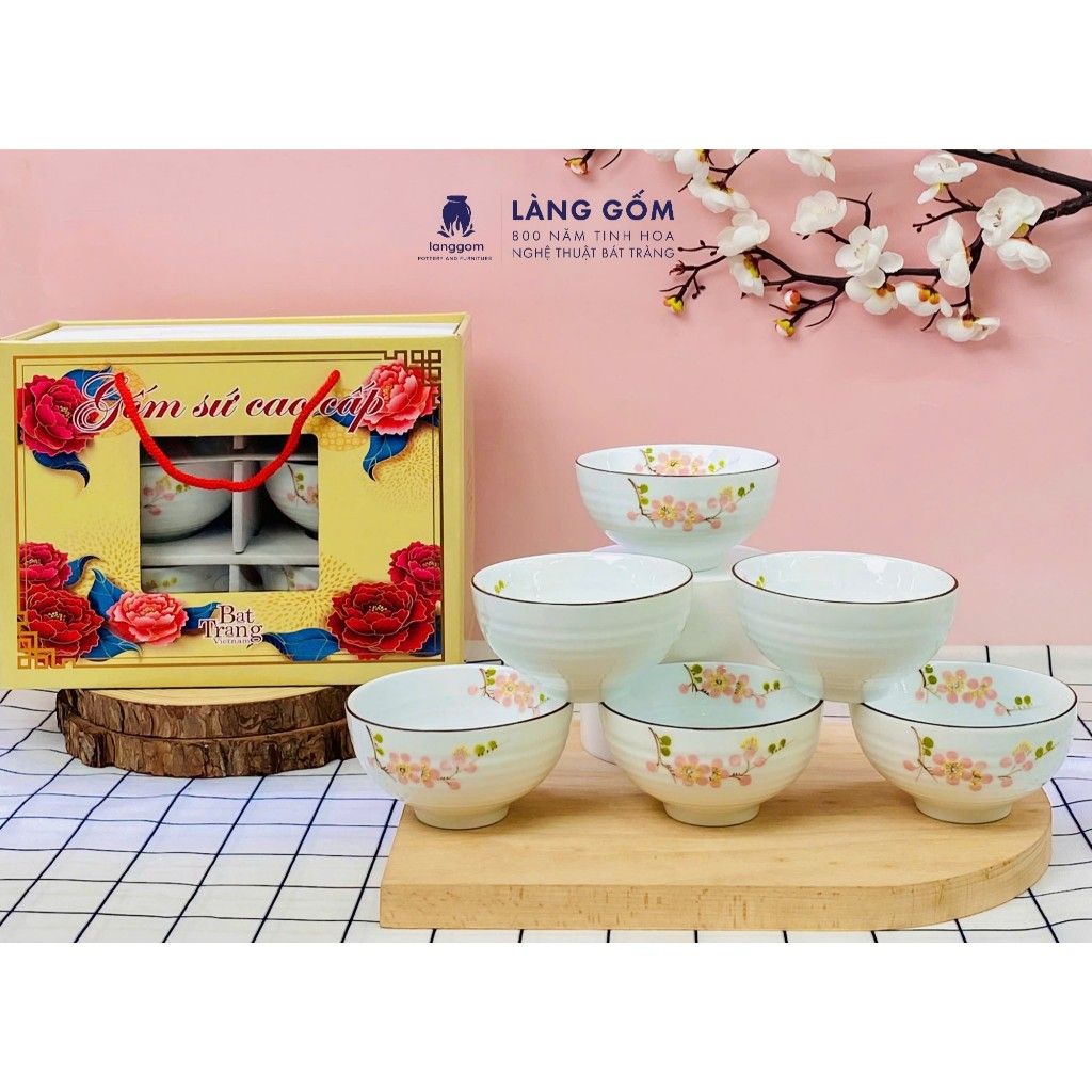 Bộ bát cơm vân đá vẽ hoa đào trắng (TH)