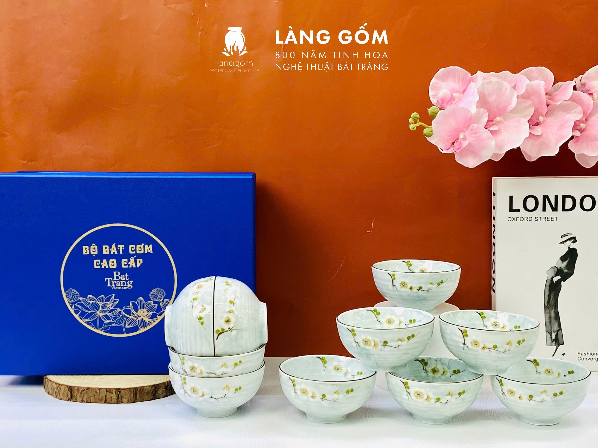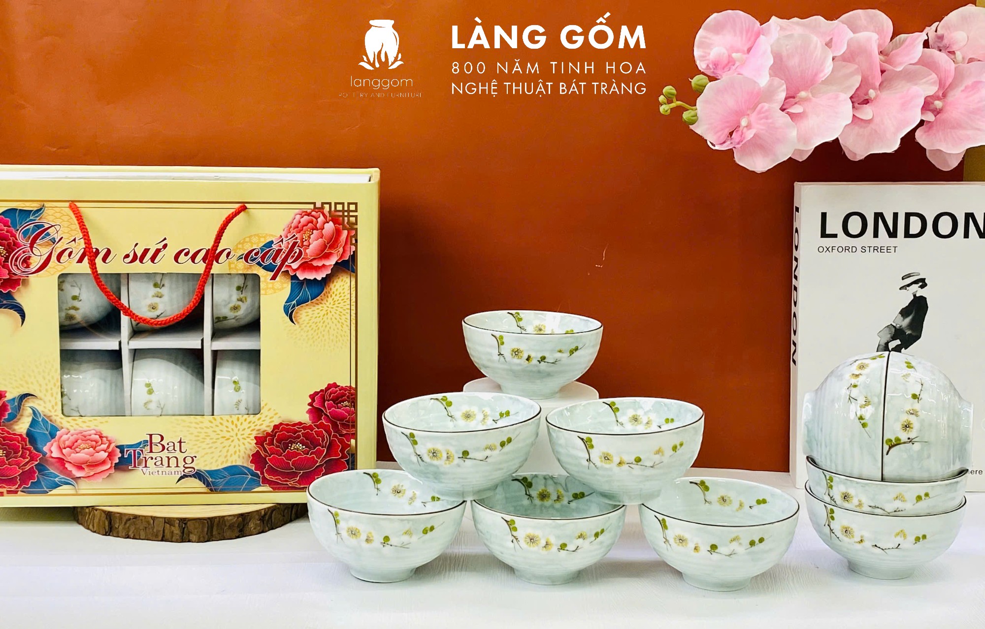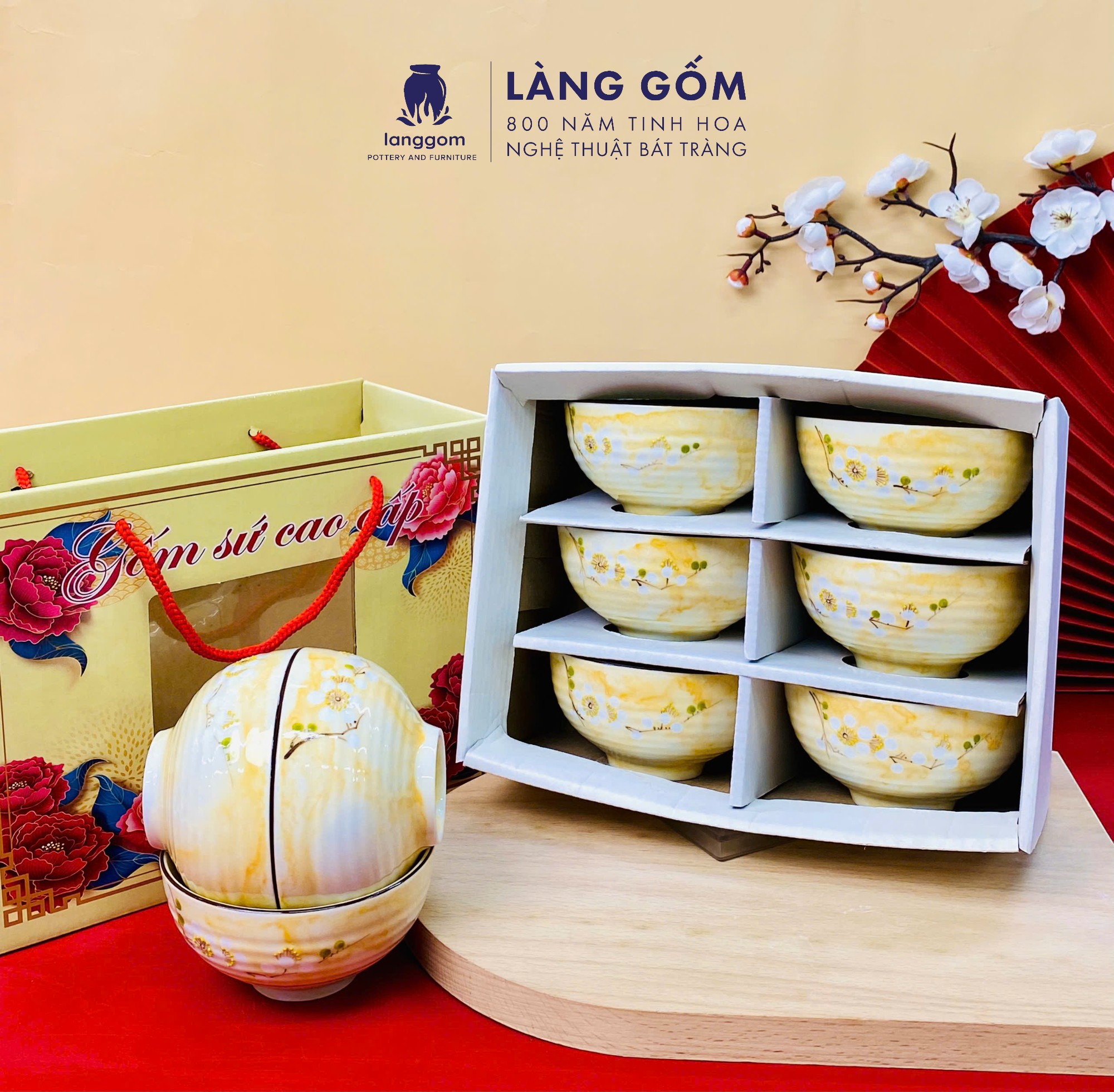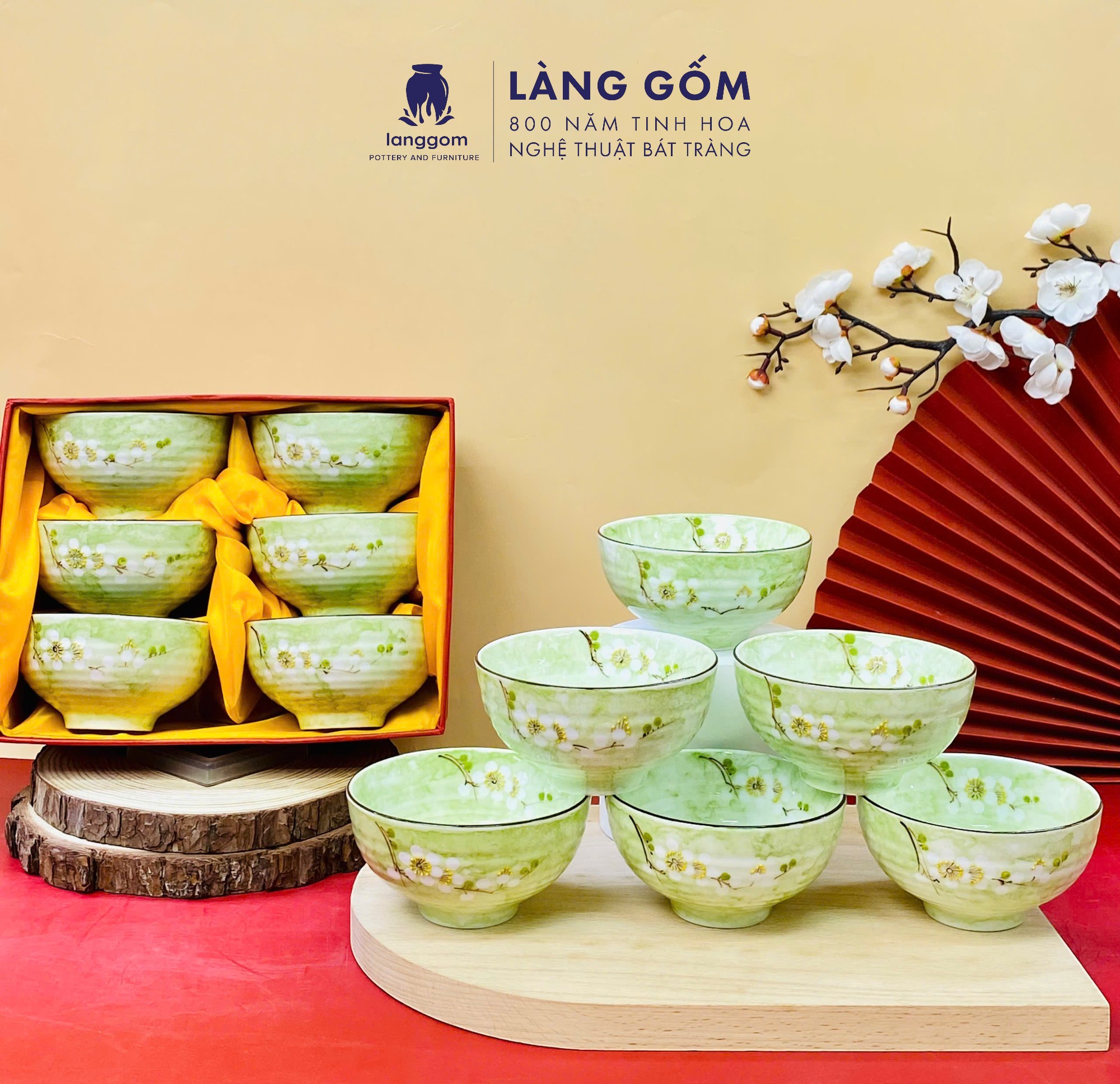 Bộ bát cơm vân đá vẽ hoa đào trắng (TH)