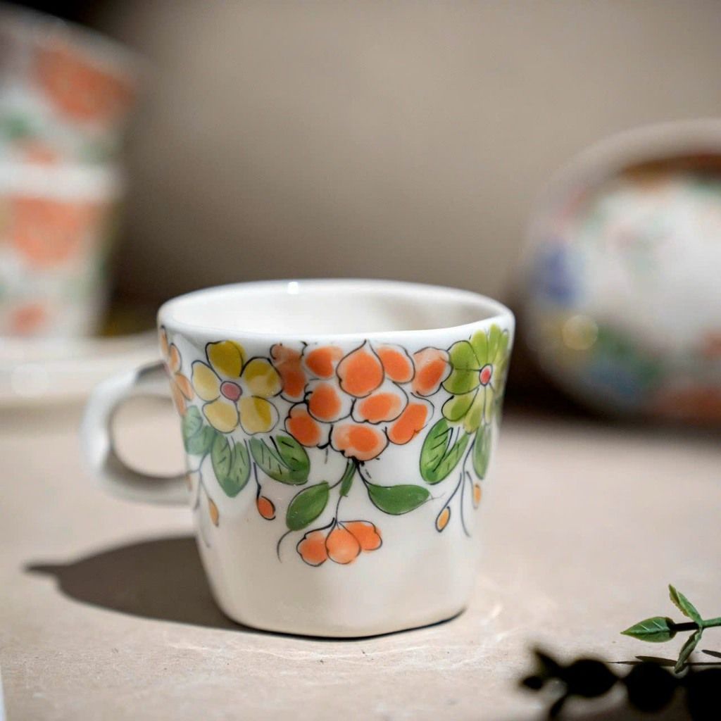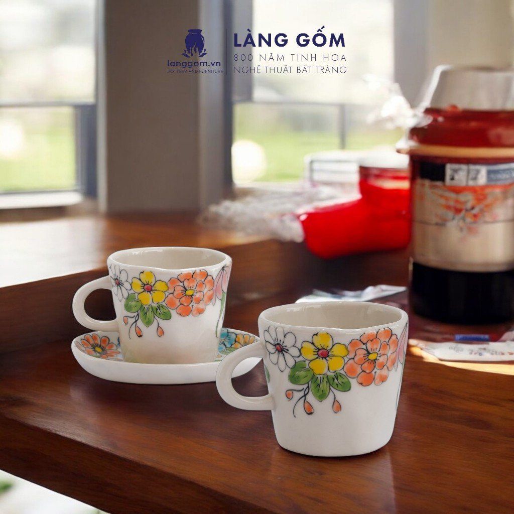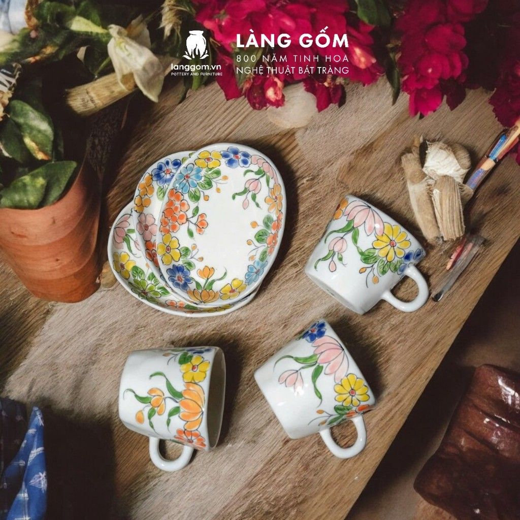 Bộ cốc đĩa lót oval họa tiết vẽ hoa lá