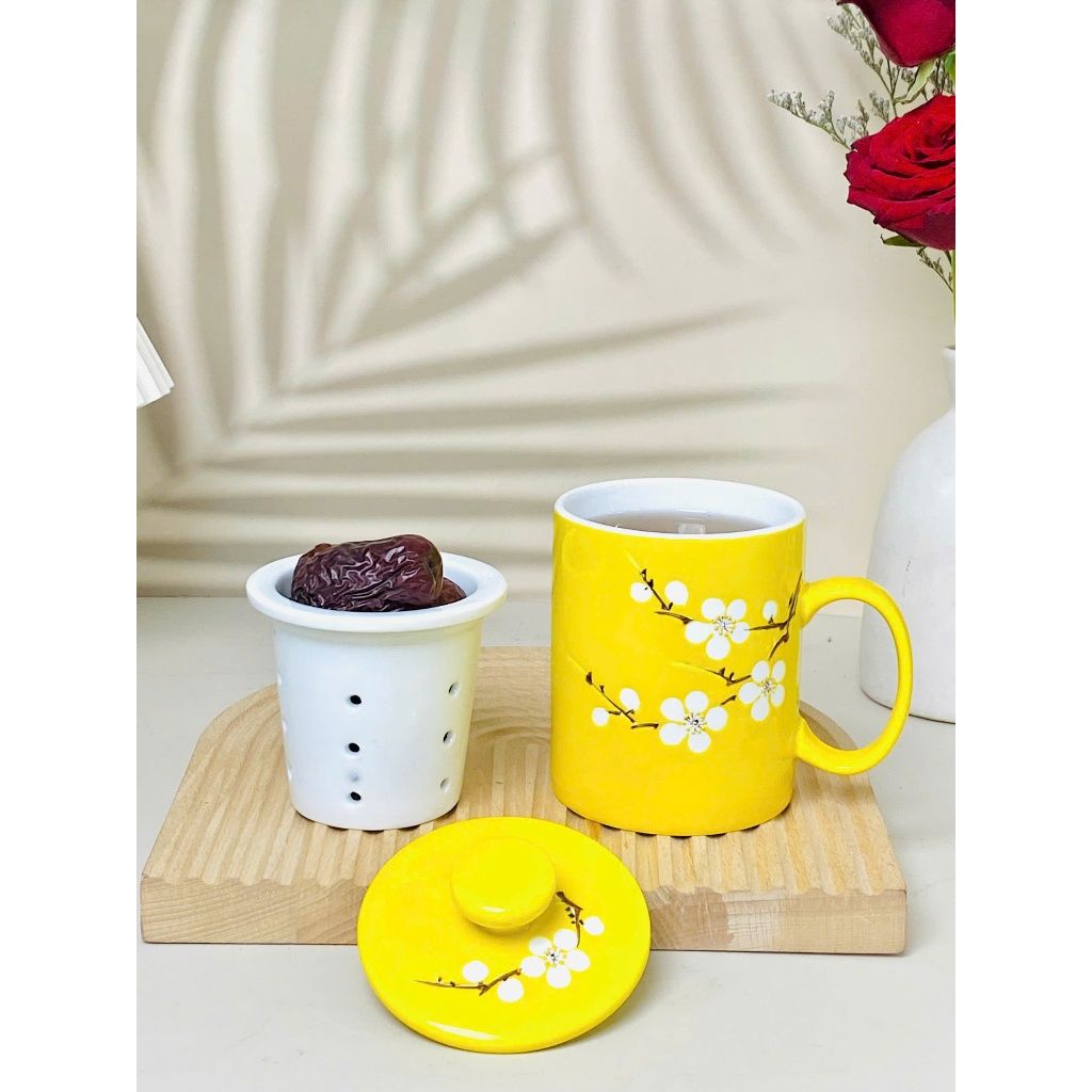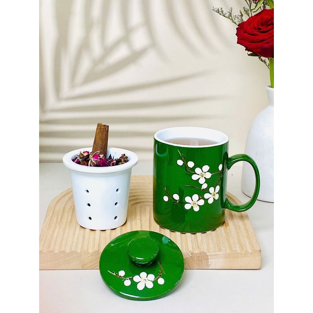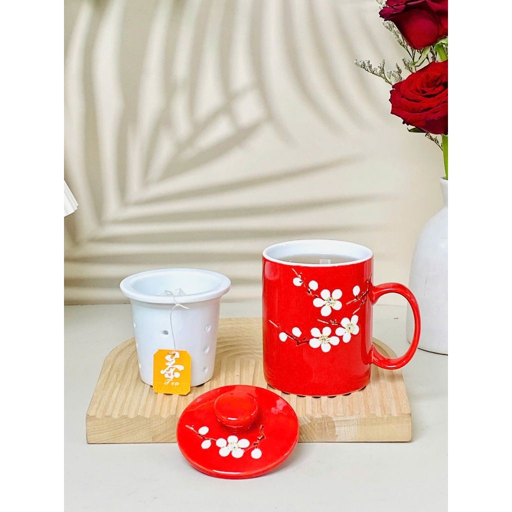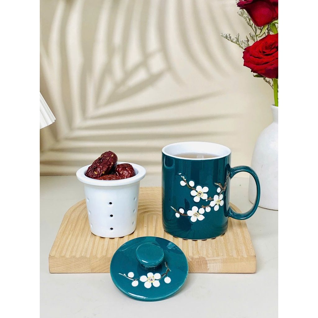 Cốc lọc trà vẽ nổi hoa đào trắng dung tích 330ml
