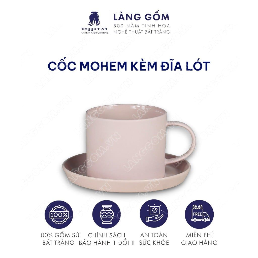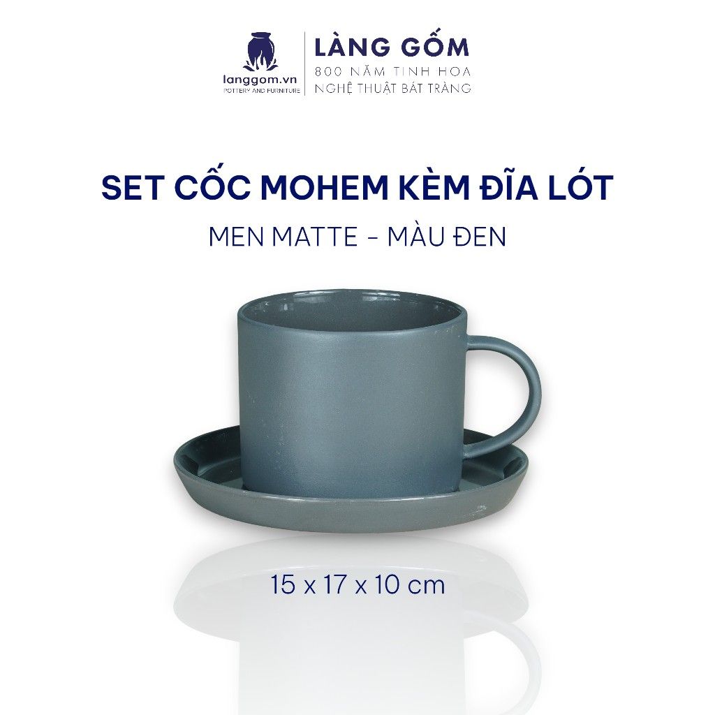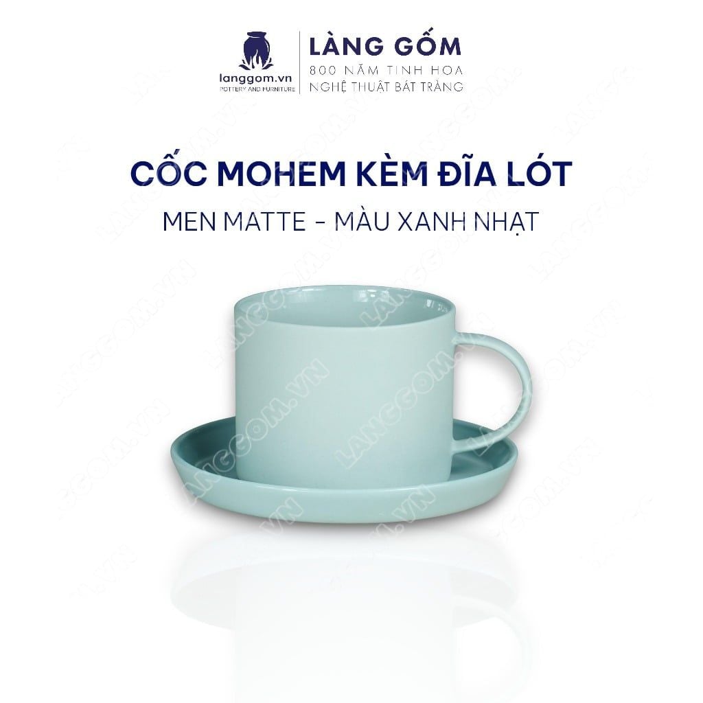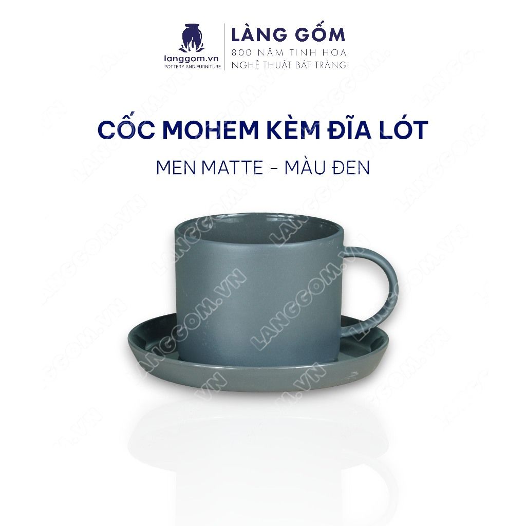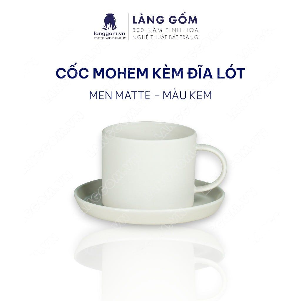Cốc ly sứ gốm có quai men mờ kiểu mohem cùng đĩa lót