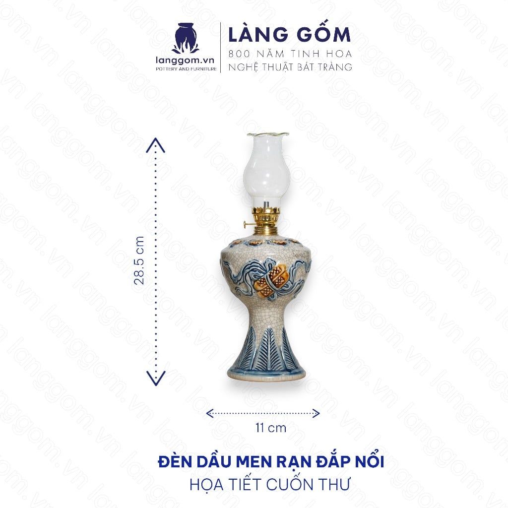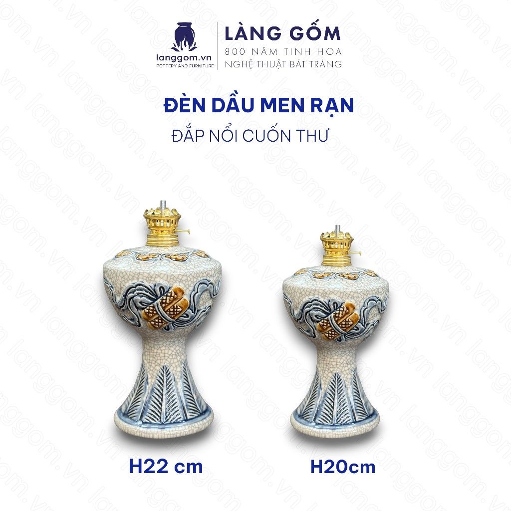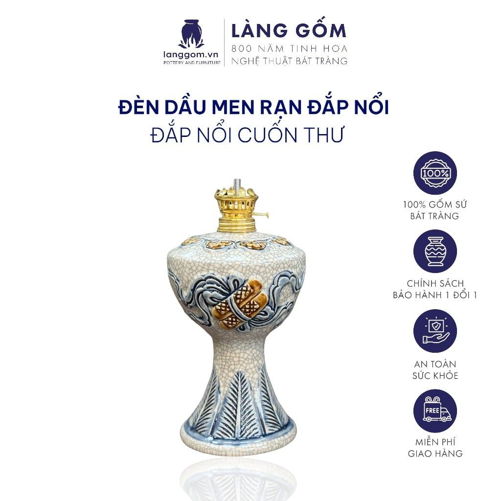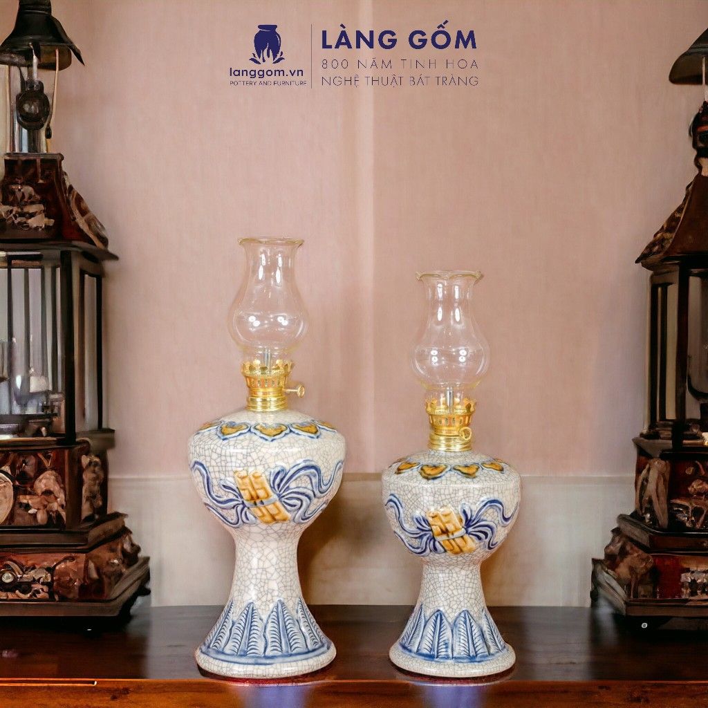 Đèn thờ cúng, đèn dầu để bàn thờ gia tiên - Bộ đồ thờ men rạn đắp nổi tinh xảo