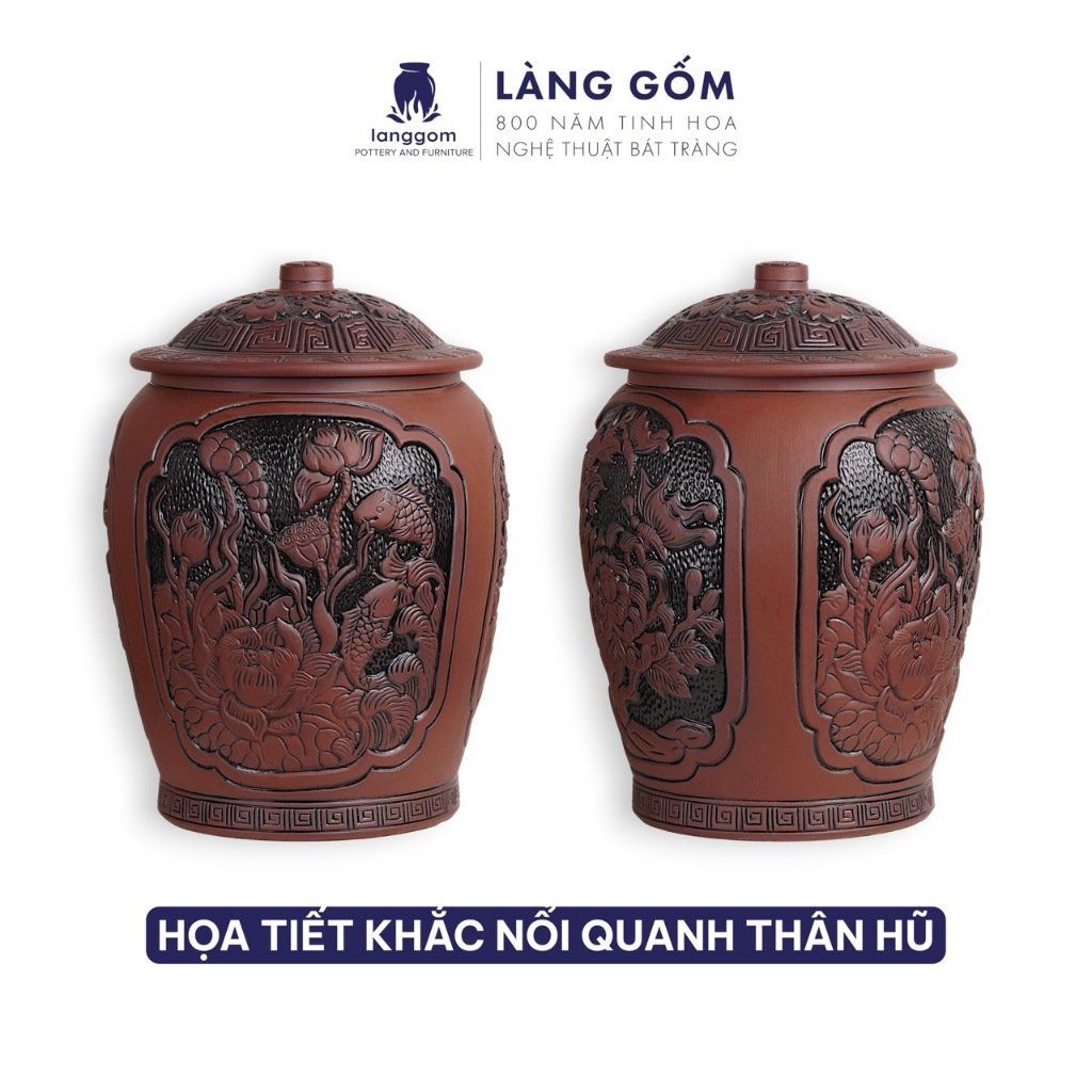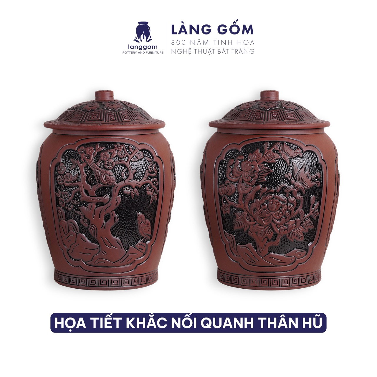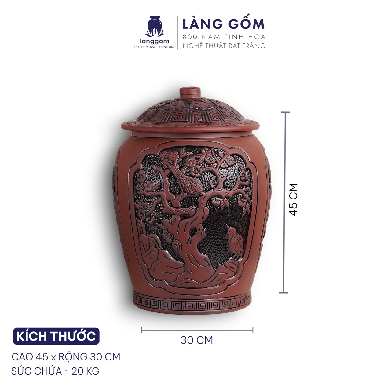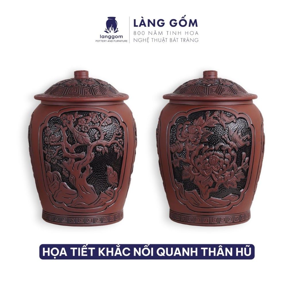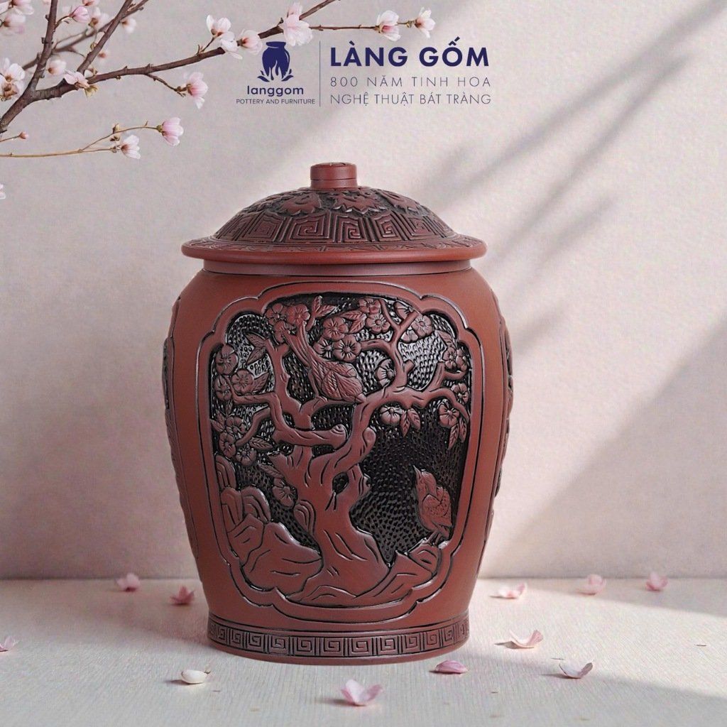 Hũ đựng gạo Bát Tràng khắc nổi Tam Hoa Thịnh Vượng