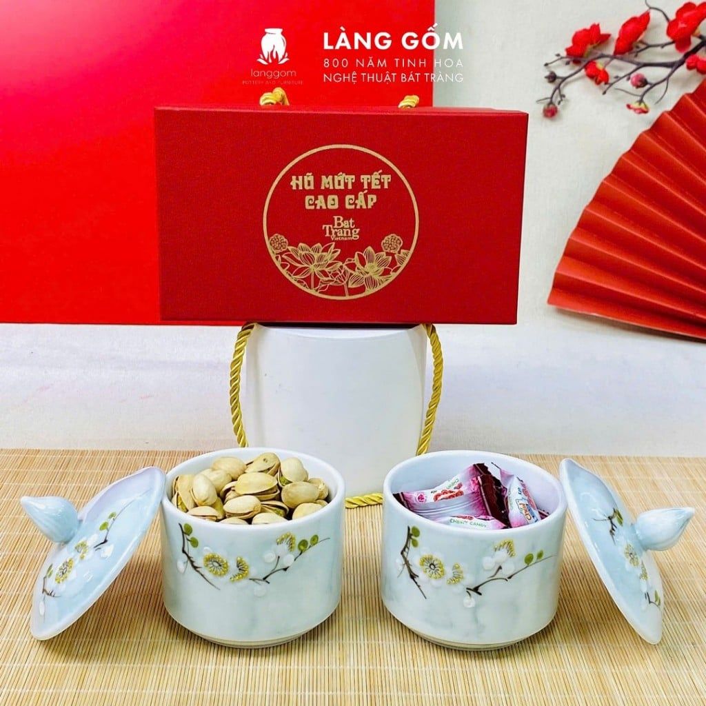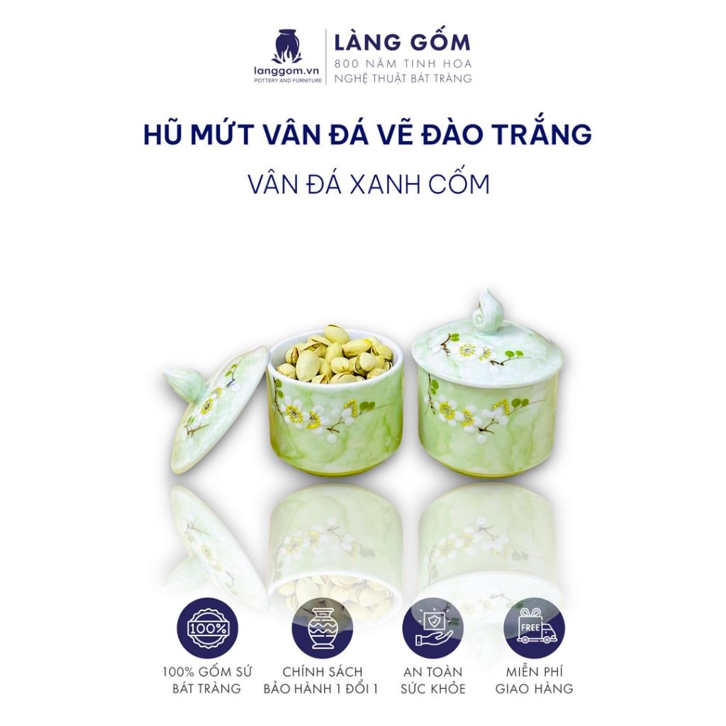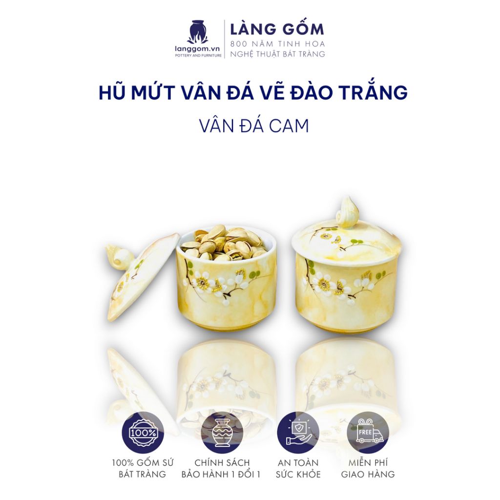 Hũ mứt sứ vân đá vẽ đào trắng