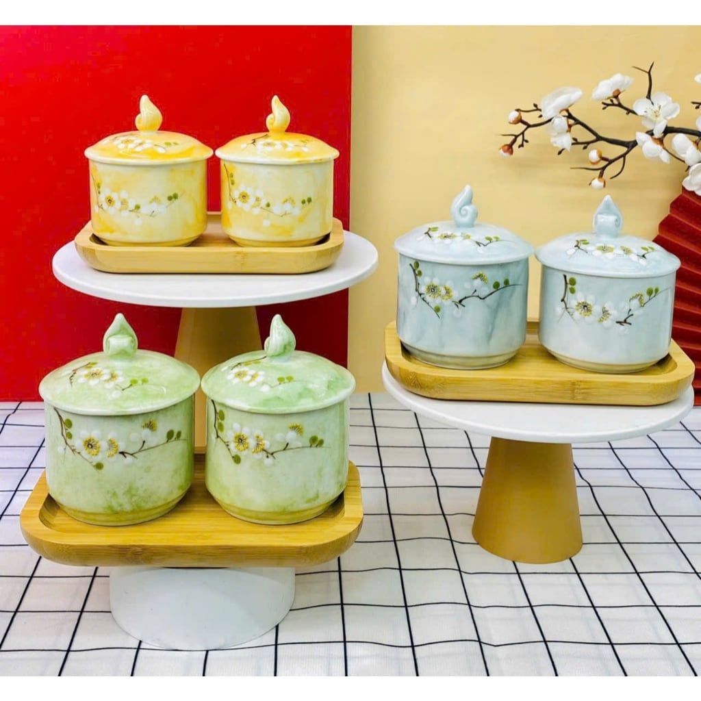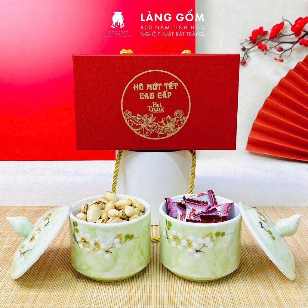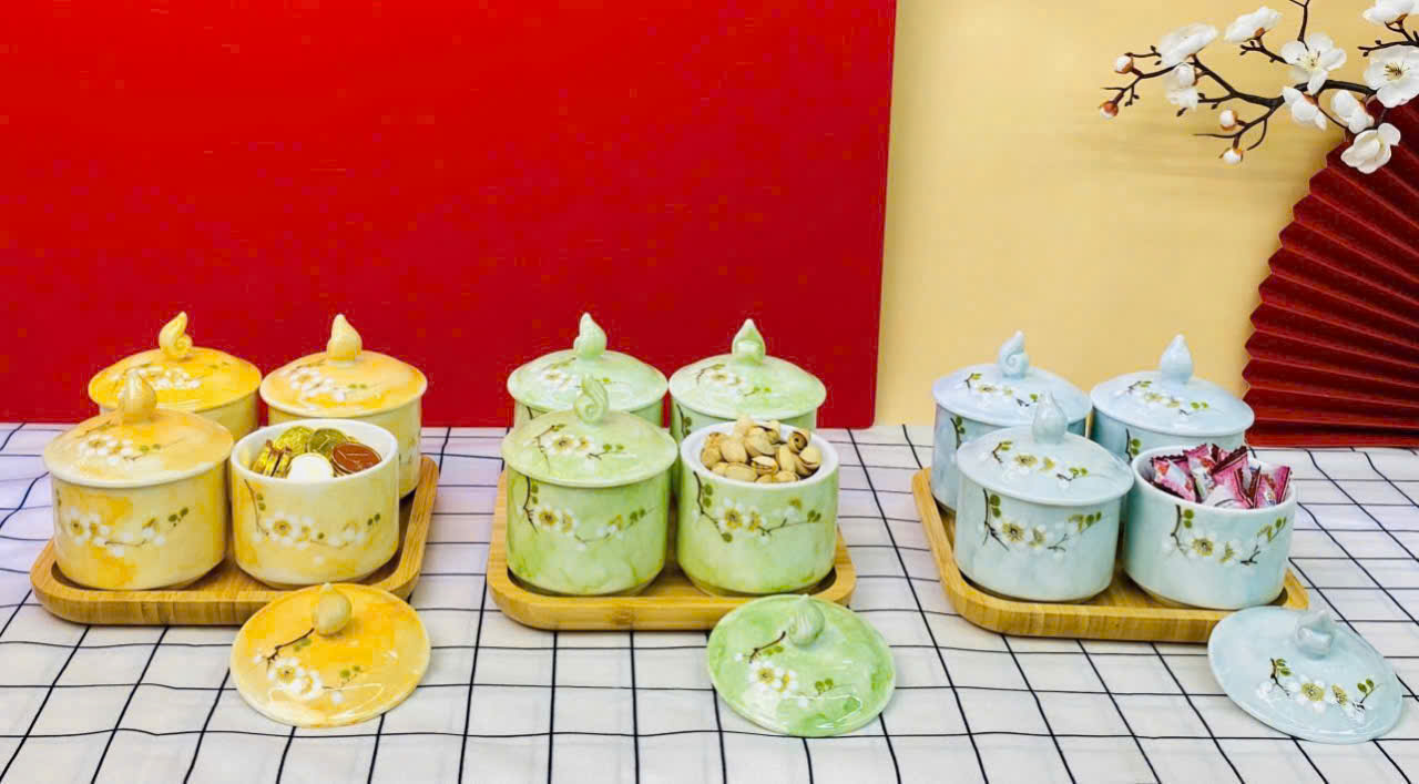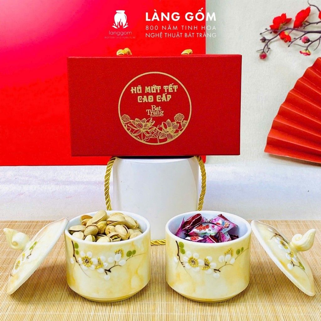 Hũ mứt sứ vân đá vẽ đào trắng