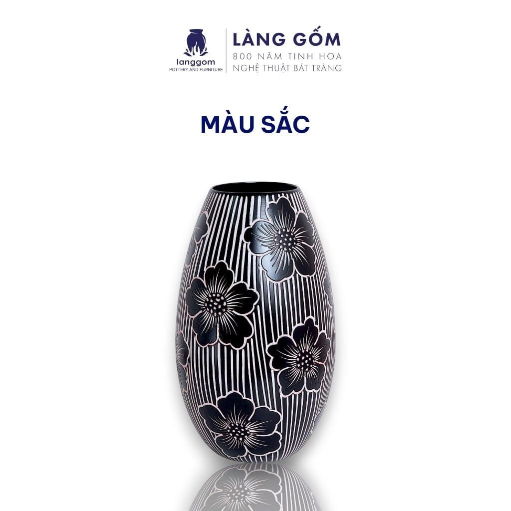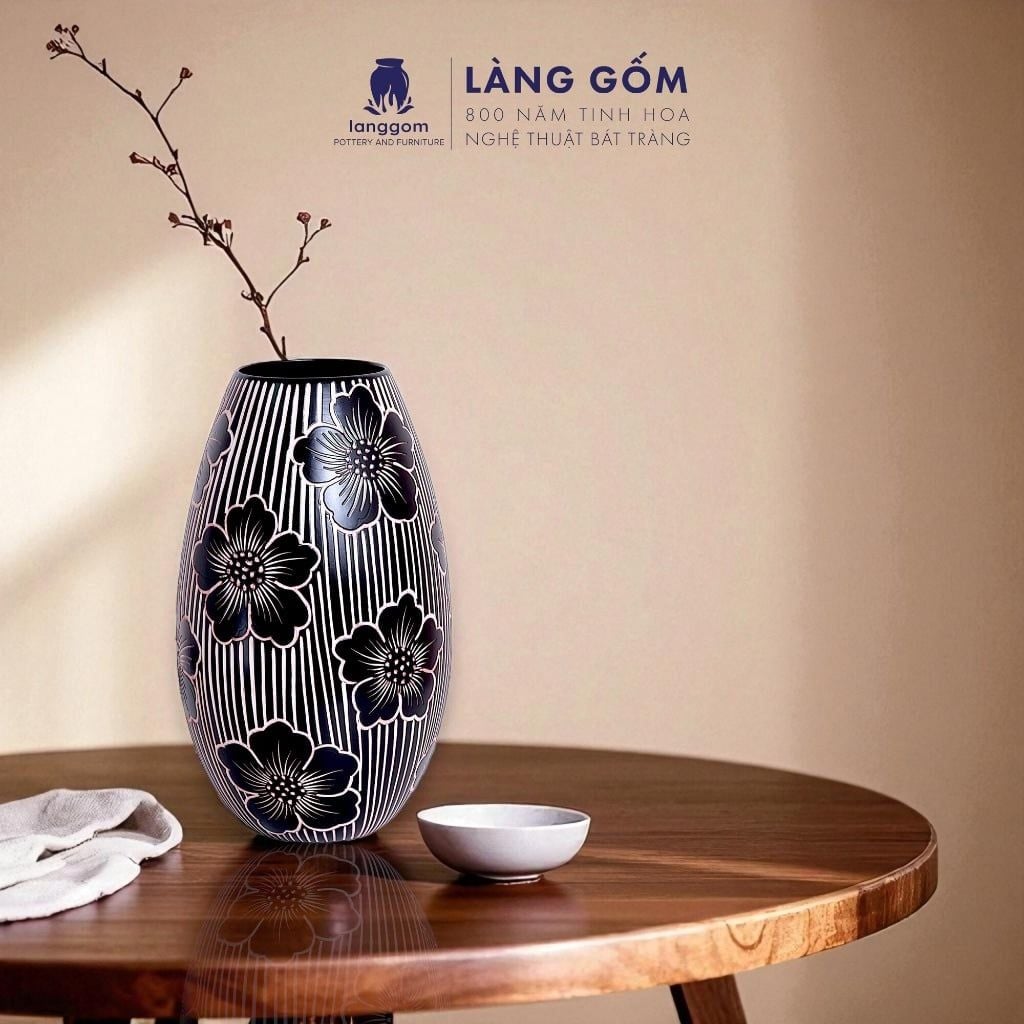 Lọ hoa men mát dáng bầu dục hoạ tiết vẽ gại màu đen