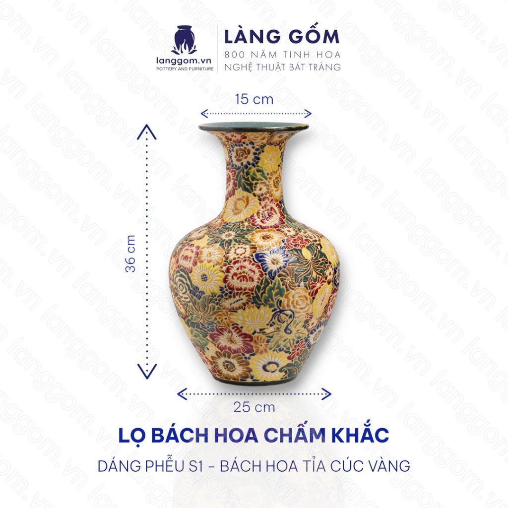 Lọ hoa vẽ bách hoa chấm màu dáng phễu - Gốm sứ Biên Hòa