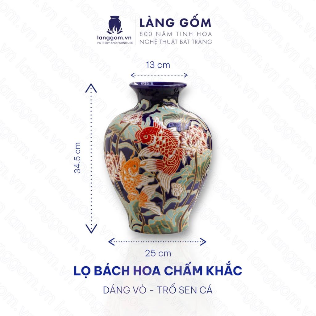 Lọ hoa vẽ bách hoa chấm màu dáng vò, họa tiết trổ sen cá